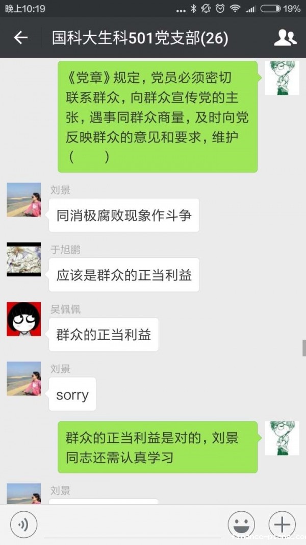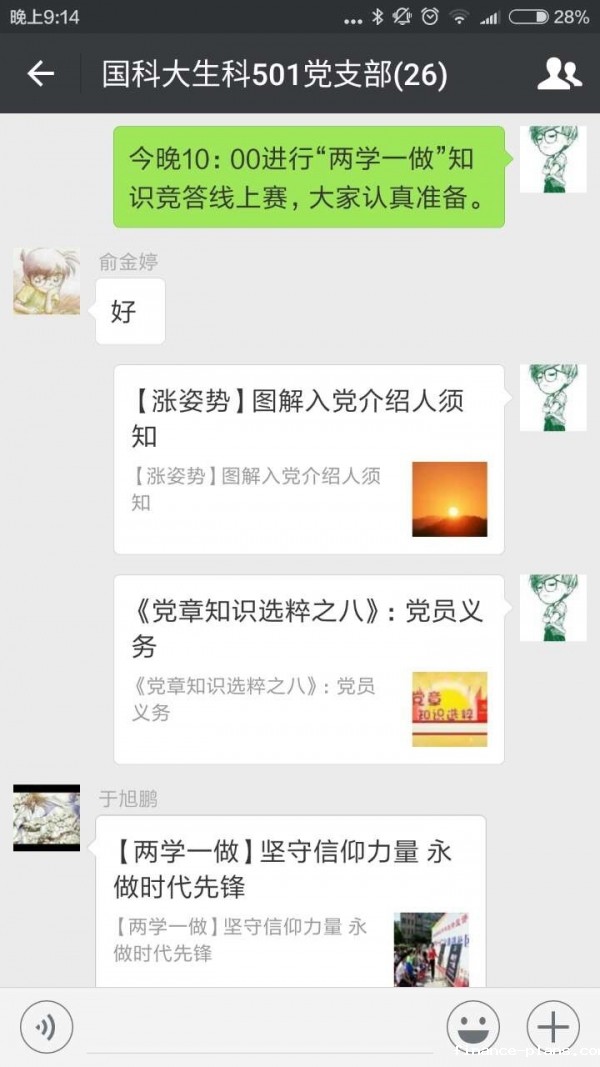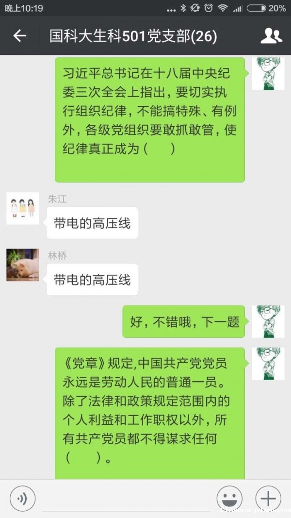 hth手机版登录入口华体育会app官方下载官网501党支部在“两学一做”的学习活动中,为了方便“两学一做”的开展和交流,利用学生党员习惯使用微信这一特点,建立了支部微信交流群。支部交流群使用近一个月来,入群党员26名,占支部党员人数的100%。该群自开通以来,支部党员在群中发言踊跃,hth网页版登录入口官网氛围浓厚。通过微信群推送两学一做的教育视频、党章党规学习心得,开展“两学一做”知识竞答、及时通知党总支以及支部的指示和要求,既快捷又方便。