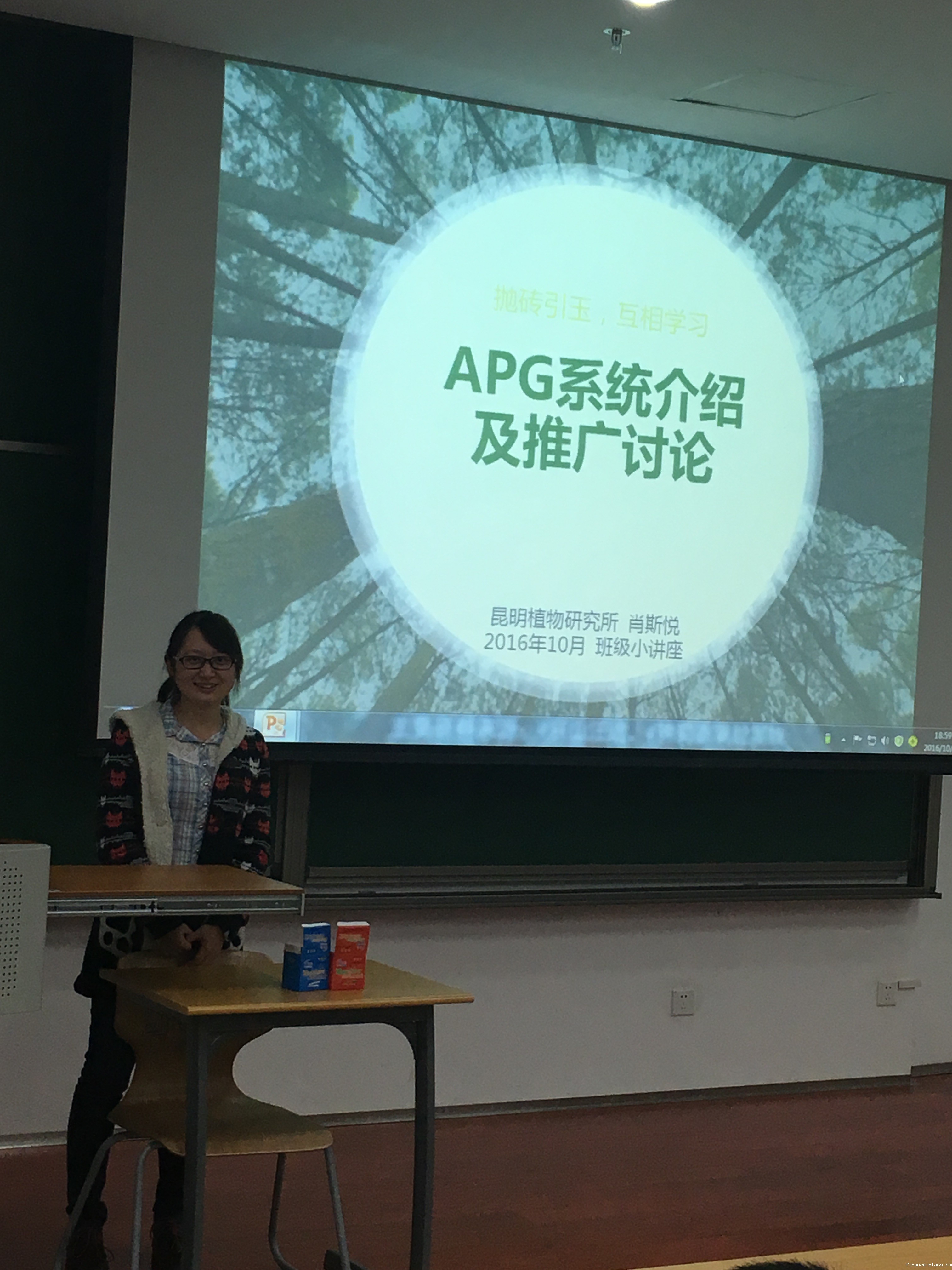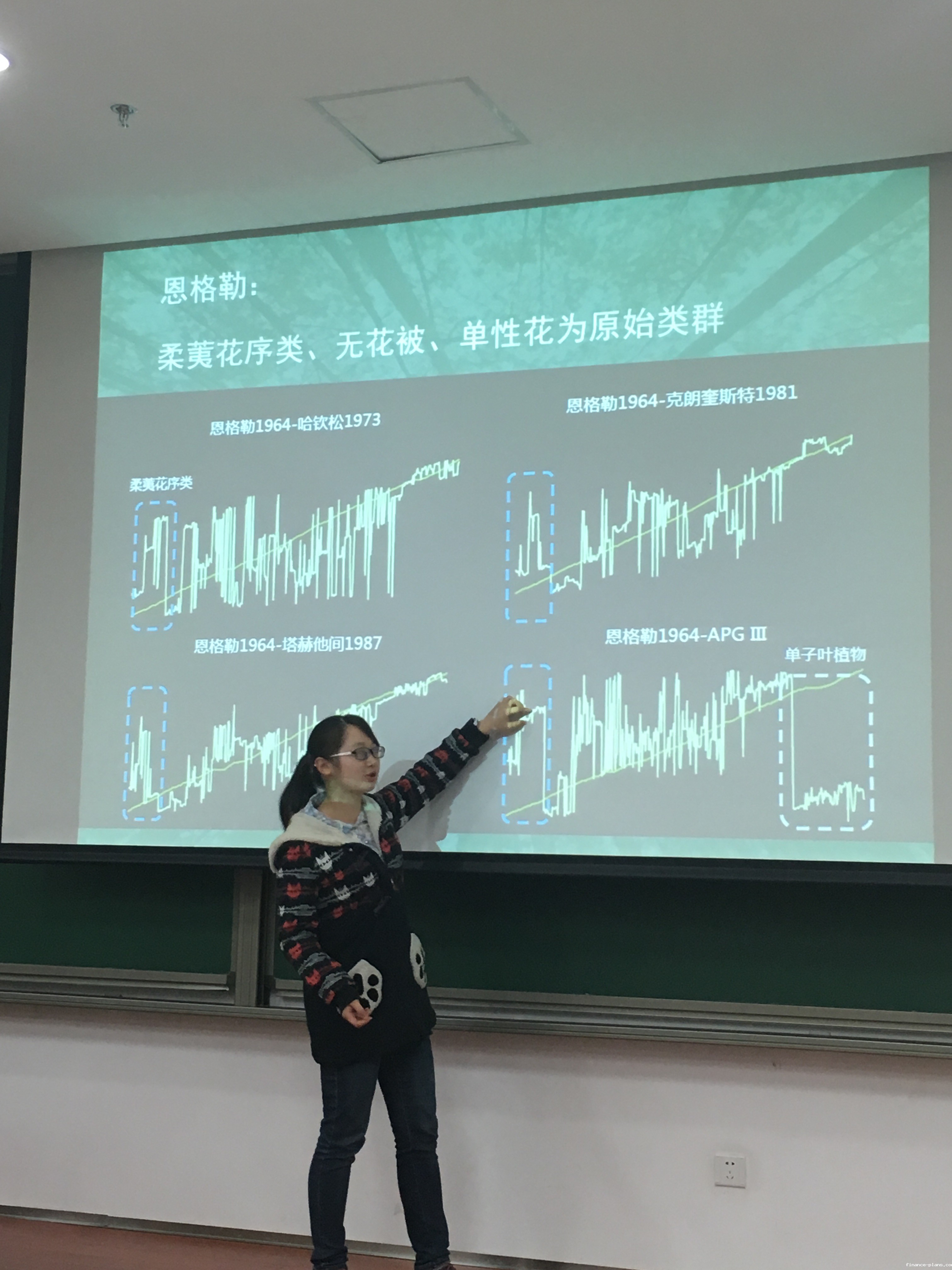 第二期的活动由来自昆明植物研究所的肖斯悦同学主讲,她主要做的是植物分类,出于对专业的热爱,她选择的是科普类的讲解,即向大家介绍被子植物分类系统,她熟练地运用丰富又极具特色的幻灯片,向大家讲述了被子植物分类系统的历史与现今国外主流但在国内才刚起步的APG系统。期间有疑问的同学也不停地提出疑问,大家进行了多次激烈的讨论。肖斯悦同学说:"生物学一直在变,我们需要紧跟时代与国际上交流,我们也需要改变"。