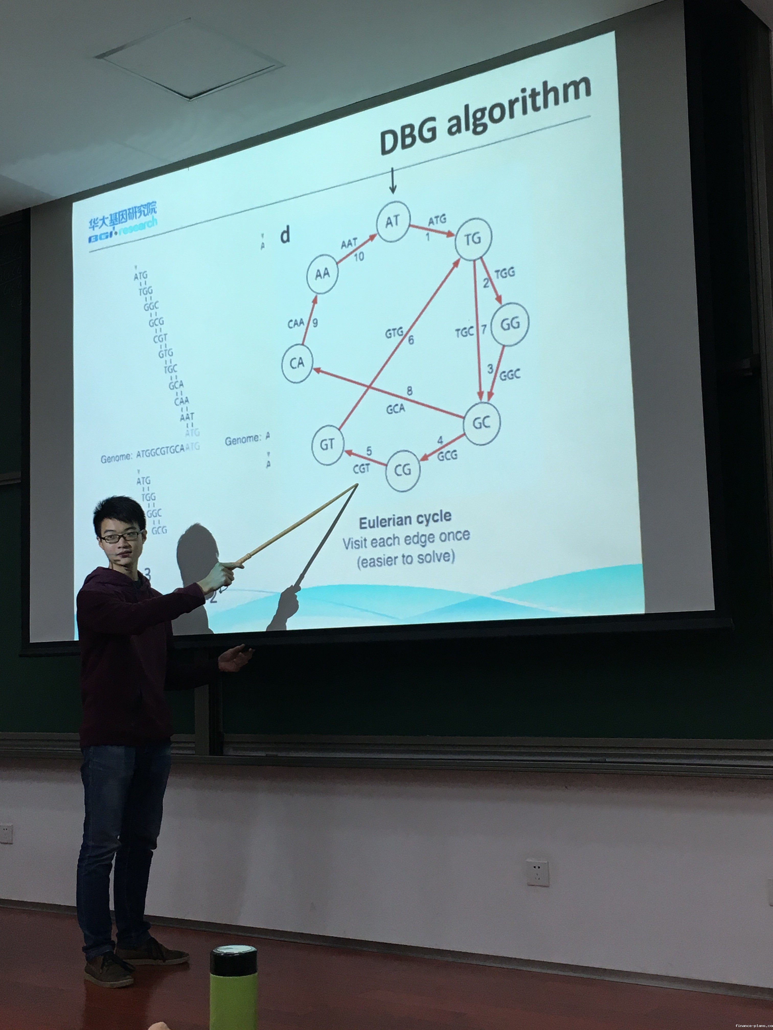 第四期由华大基因的翁建聪同学分享了《基因组装的算法与策略》。翁建聪从概念出发,运用风趣的措辞向大家介绍了基因组装的概念及原理。基因组装就是把测序下的短序列根据他们之间的重叠关系将序列尽可能地延长,其目的是得到全基因的序列。他介绍了两个关于组装的算法,分别是一代测序技术中的OLC 算法和用于二代测序技术的DBG 算法,以及在序列组装中起重要作用的欧拉图路径(Eulerian Cycle)进行了说明。翁建聪同学阐述了基因组装的一般流程,并详细介绍了影响基因组装的4个因素:测序错误、重复序列、物种杂合度、样品污染程度。最后,他对评估基因组装的好否的指标做了详细说明。讲课过程中不少同学对于本次讲堂的主题表现出很大的兴趣,纷纷提出问题,而翁建聪同学对此都能一一作答,得到了同学们都认可。