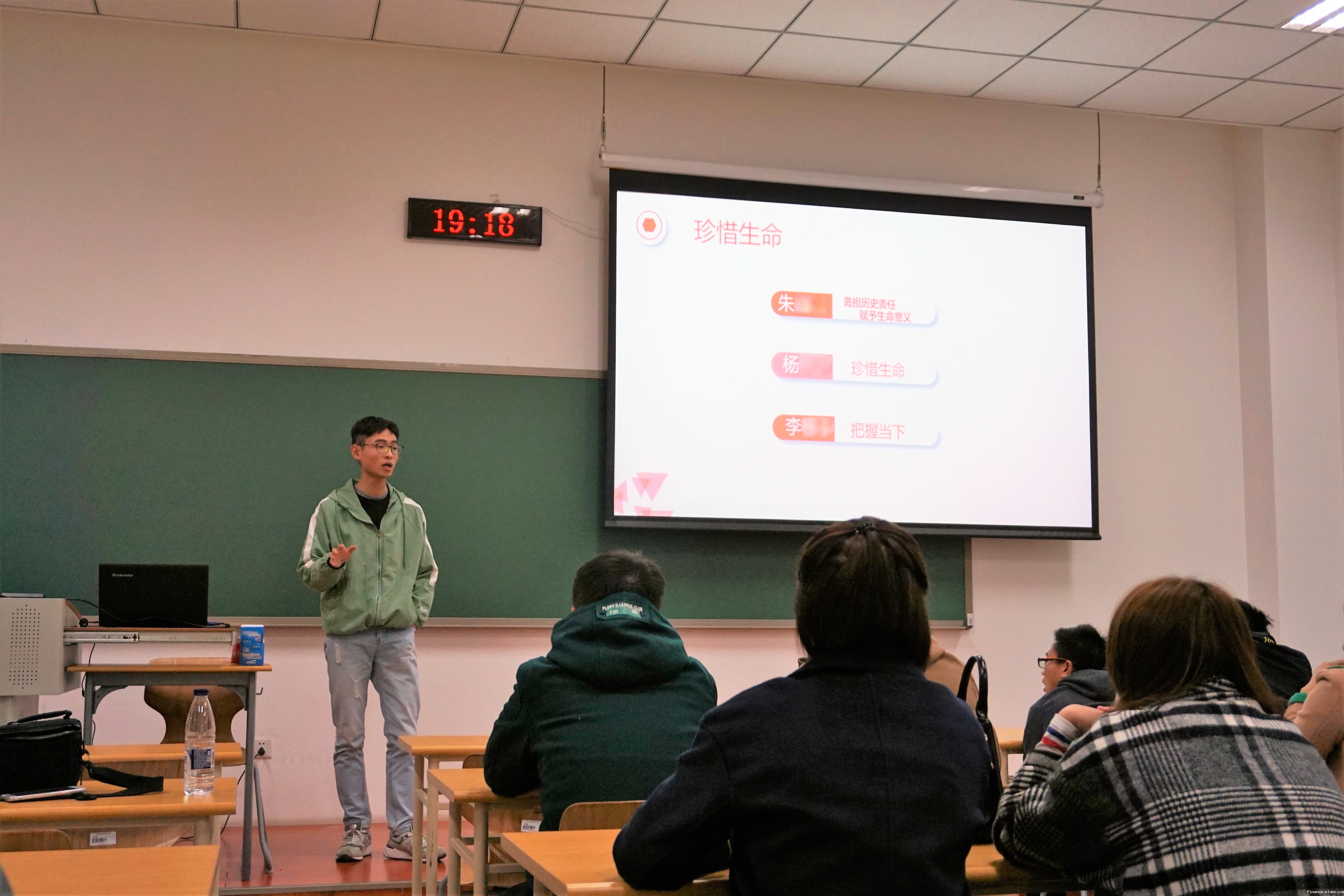 紧接着杨梦柳同学引入当代大学生自杀案例,并解释心理问题是自杀的主因,通过情绪、身体反应、思维方式及社交状况四个方面介绍抑郁倾向,号召大家正确认识心理问题,懂得自救和寻求社会支援,珍惜生命。其后,504班的李栋宇同学积极参与分享,以自身经历告知大家把握当下的重要性。