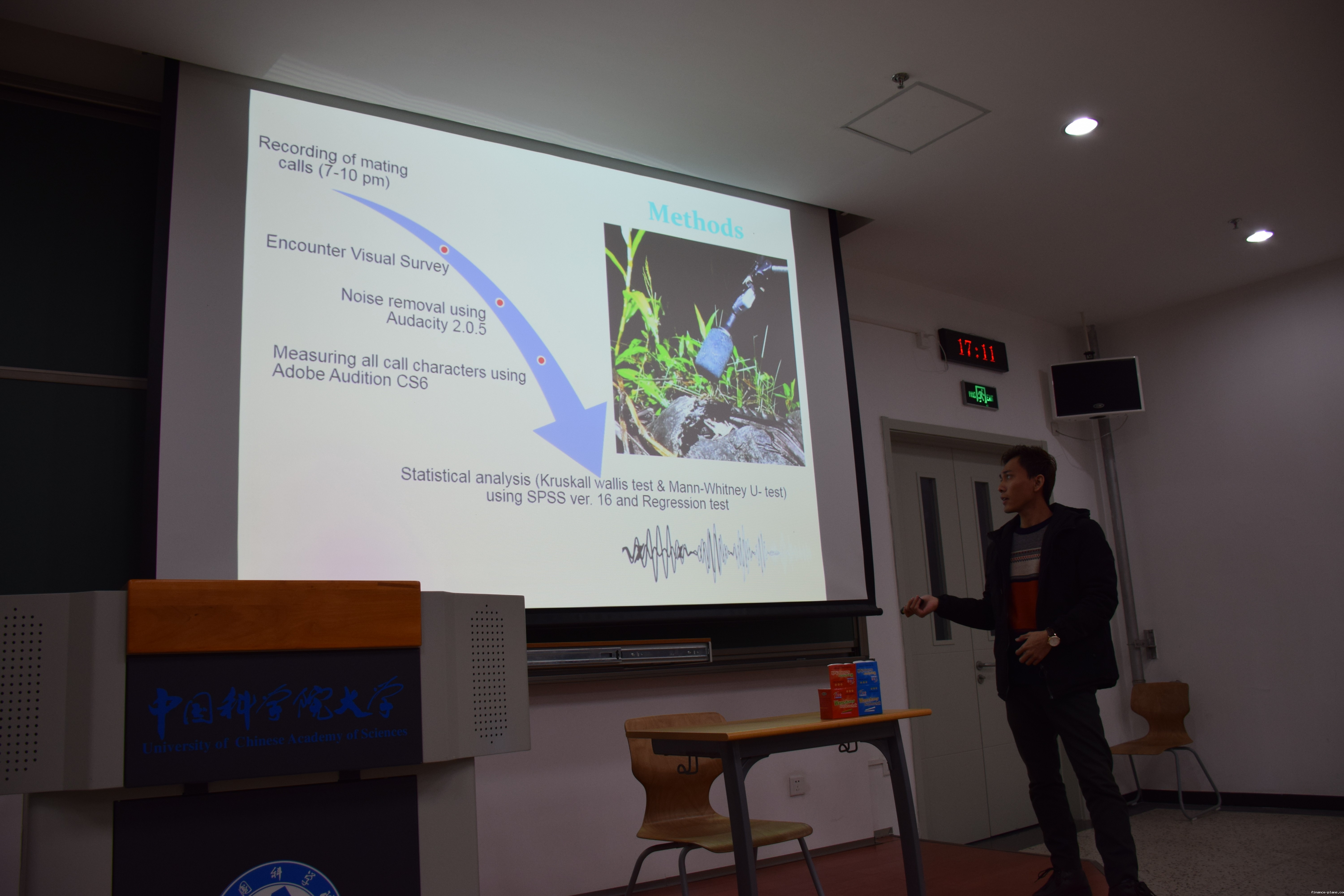 下午三点半游园结束后,大家又参加了在教二107教室开展的学术交流活动。四位优秀的报告人Ade、Mat、董冰、江秋煜分别做了精彩的全英语报告。报告题目分别是Temporal character variation of Nicobar Island Frog's mating call in different habitat types around oil palm plantation in West Sumatera(介绍了西部苏门答腊油棕榈种植区不同生境类型尼哥巴岛蛙交配时间的特征变化),