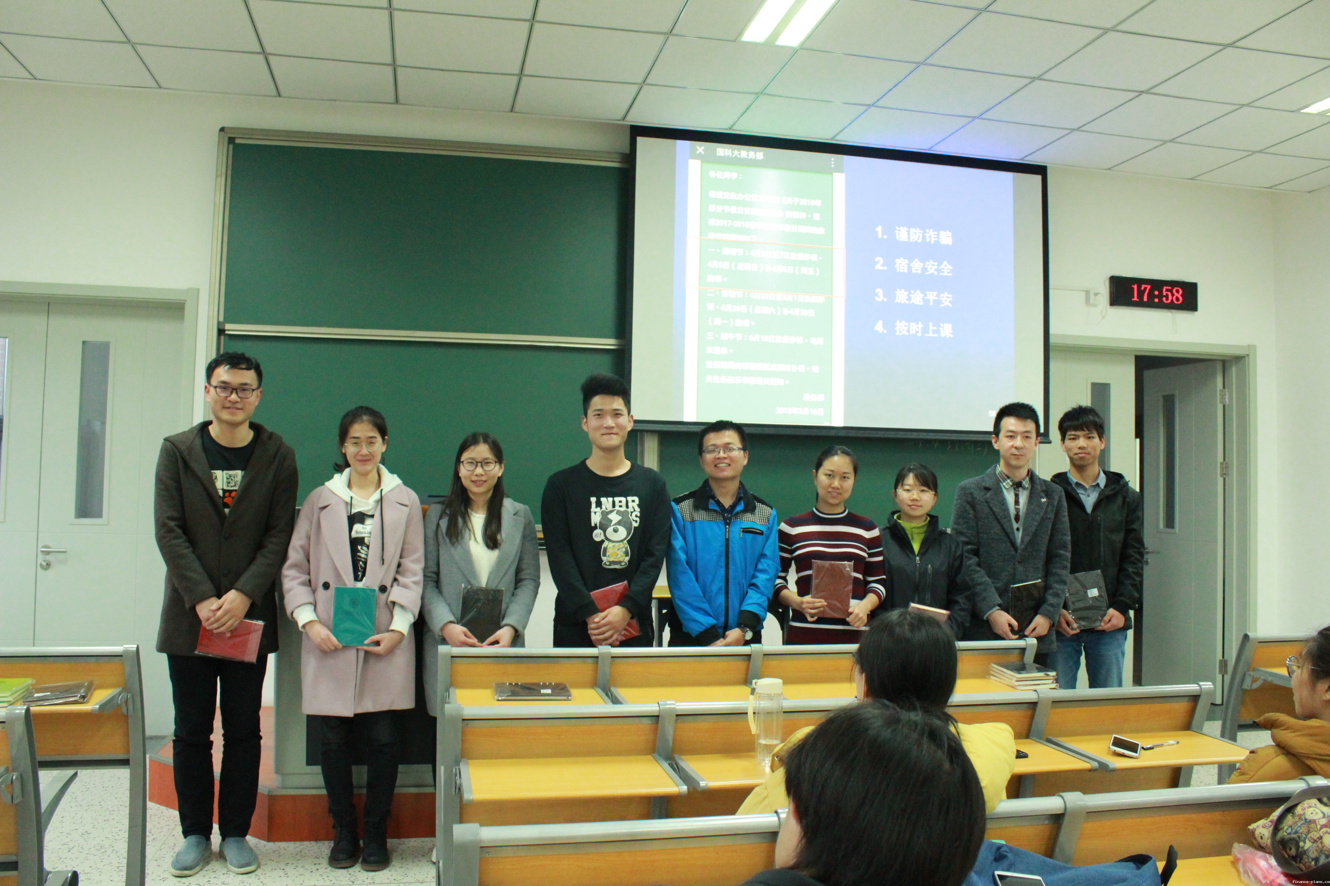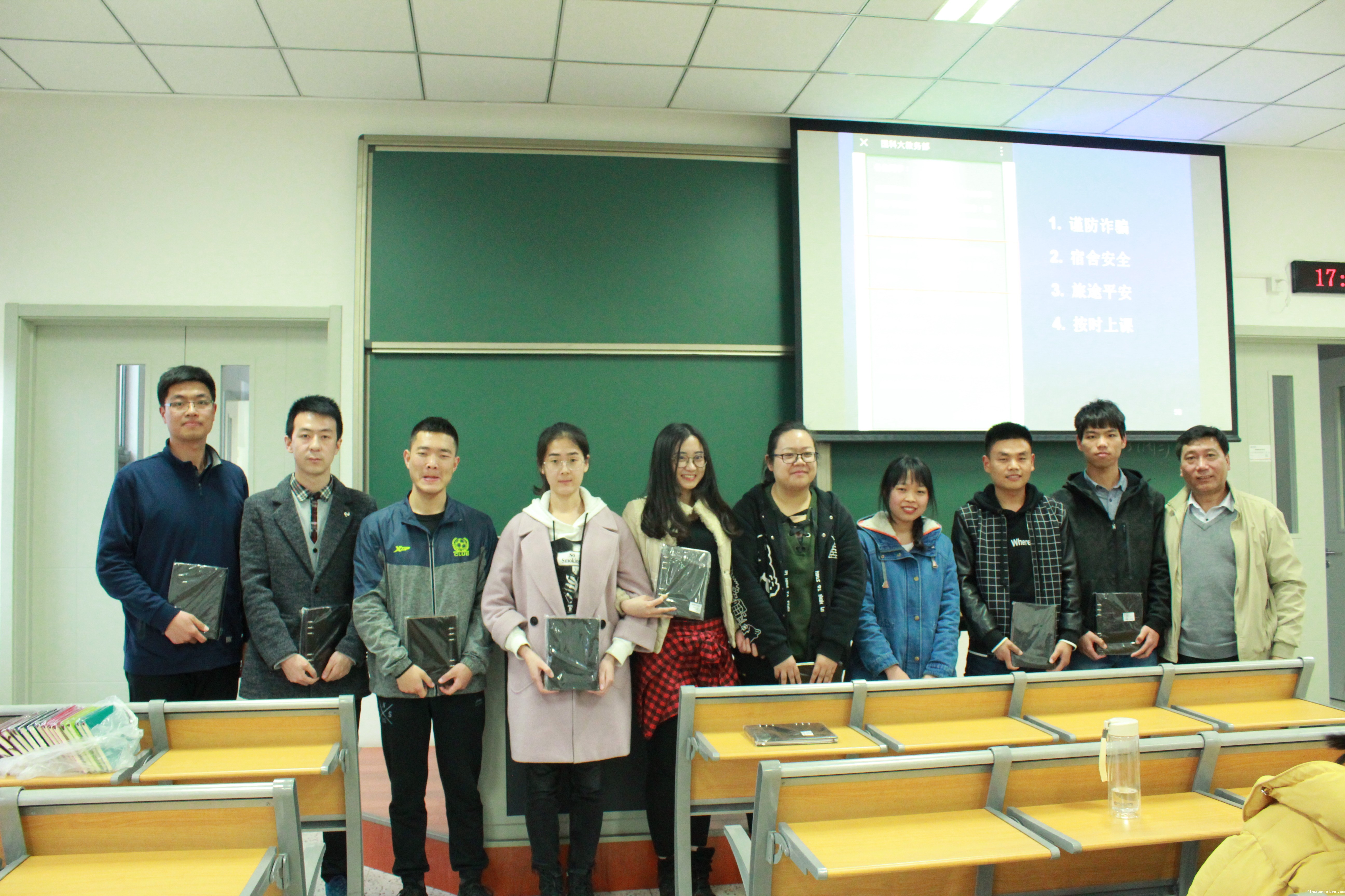 班会的第二大项,班长周阳与班主任刘占良老师商议决定给为班级建设作出贡献的同学颁发礼品。班会肯定了秋季学期班委及寝室长的工作,并为这些为班级工作做出努力的同学精心准备了国科大logo的纪念笔记本。