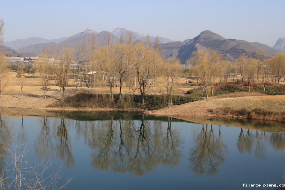 水是眼波横,山是眉峰聚。雁栖湖畔,苍树林立,春风袭来,水影荡漾,莫不静好;远处,小山悠然而卧,草木稀疏,陡峭处,岩石毕露,颇为壮观。远近结合,雁栖湖构成一幅美丽的画卷;驻足凝望,雄浑壮阔之感油然而生。