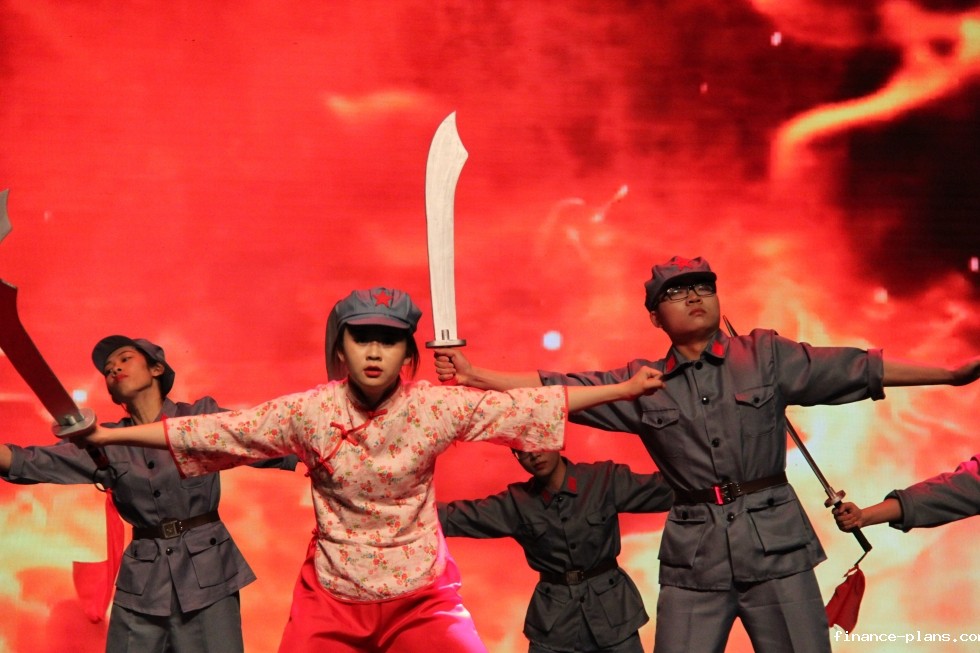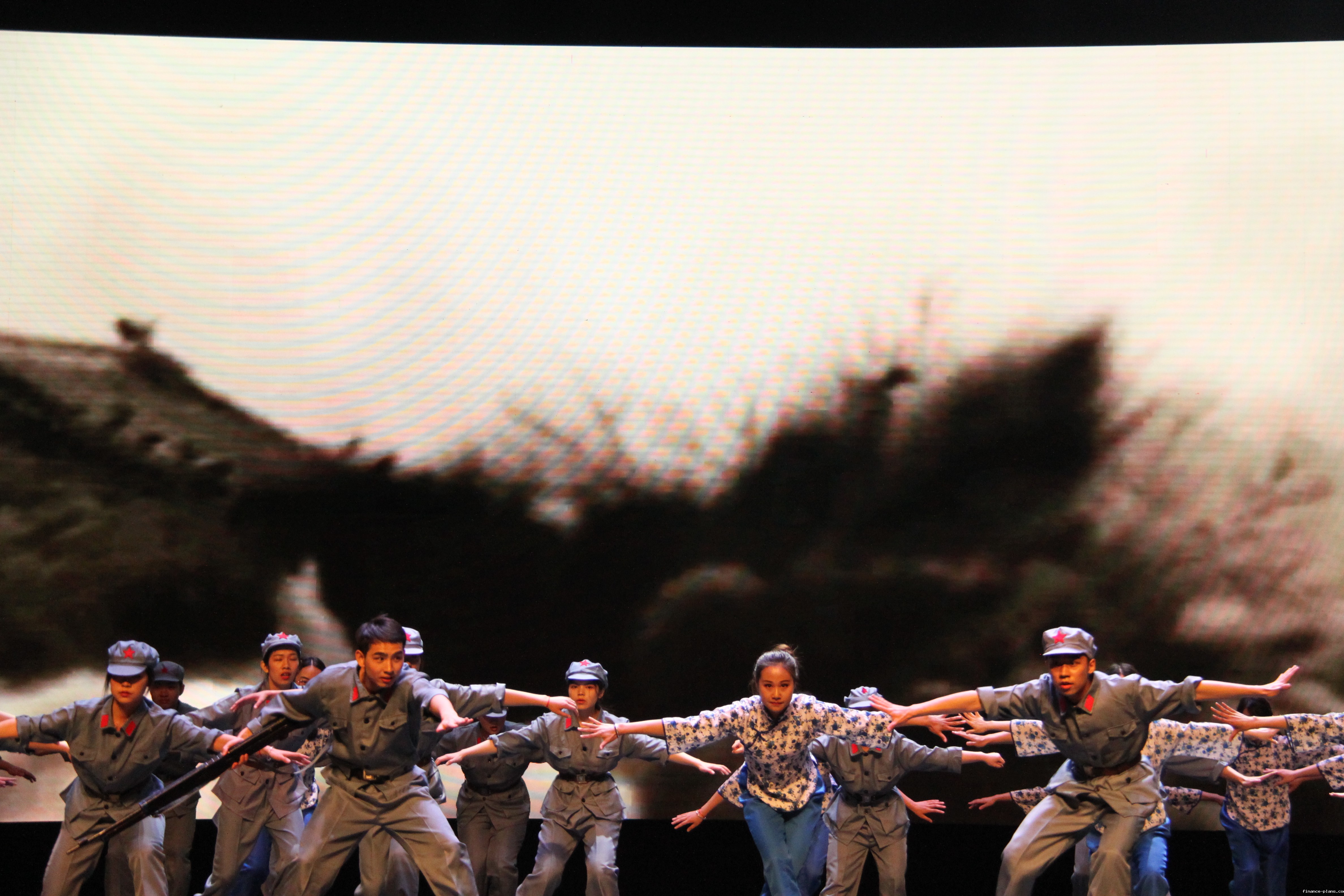 第二幕《井冈儿女》,同学们演绎了老百姓为红军战士送粮并积极参军、踊跃投身革命的故事,男女主人公成为了并肩作战的革命夫妻。背景恢弘,动作利落,通过训练舞刀的场景,每位同学将红军顽强不屈、英勇果敢的精神表现的淋漓尽致。