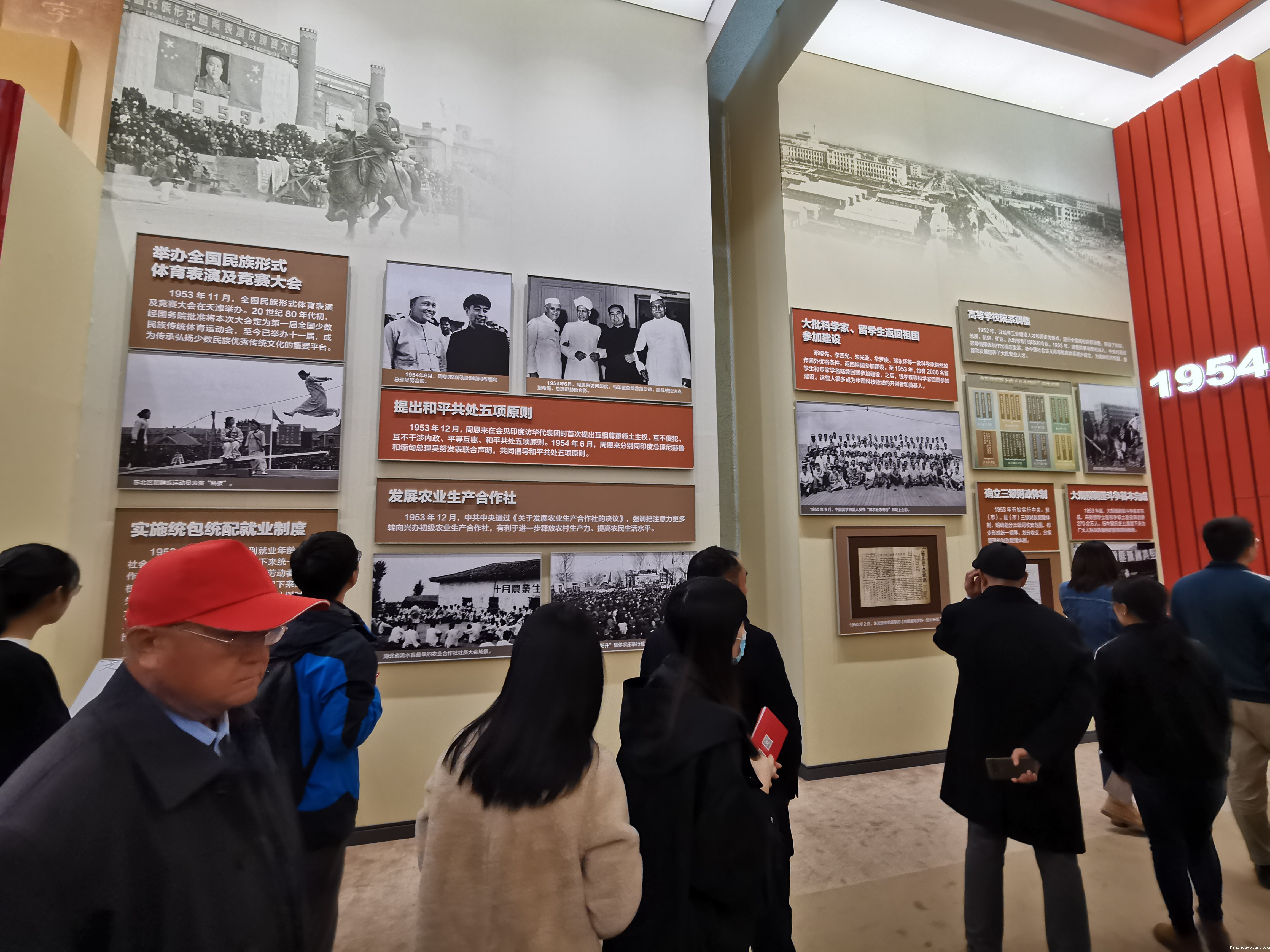 此次展览以“时光隧道”的形式,为人们展示了从1949年新中国成立到2019年伟大复兴的风云巨变。展览采用了编年体形式,沿着七十年的时光隧道向前推进,屹立东方(1949-1978)、改革开放(1978-2012)、走向复兴(2012年至今)和人间正道正如一幅幅波澜壮阔的历史画卷在眼前徐徐展开。本次展览通过图片展示、笔记本等实物展示、视频放映等形式,集中立体的为参展者展示了建国以来的巨大成就和历史过往。一进入展厅,同学们的目光便被吸引:“蓝天白云”的灯光映衬下是五位国家领导人的照片,新中国70年的发展正是由这五位国家领导人带领的。1949年的原声开国大典的影像记录,当毛主席在天安门城墙前庄严的宣布“中华人民共和国成立了”的那一刻,无论是当时参与了1949年开国大典的人们还是现在正在参展的人们,都燃起了深深的自豪感和爱国情。从1949年到1978年,刚“出生”的新中国通过改革开放等一系列变革,带领新中国人民走向了美好。