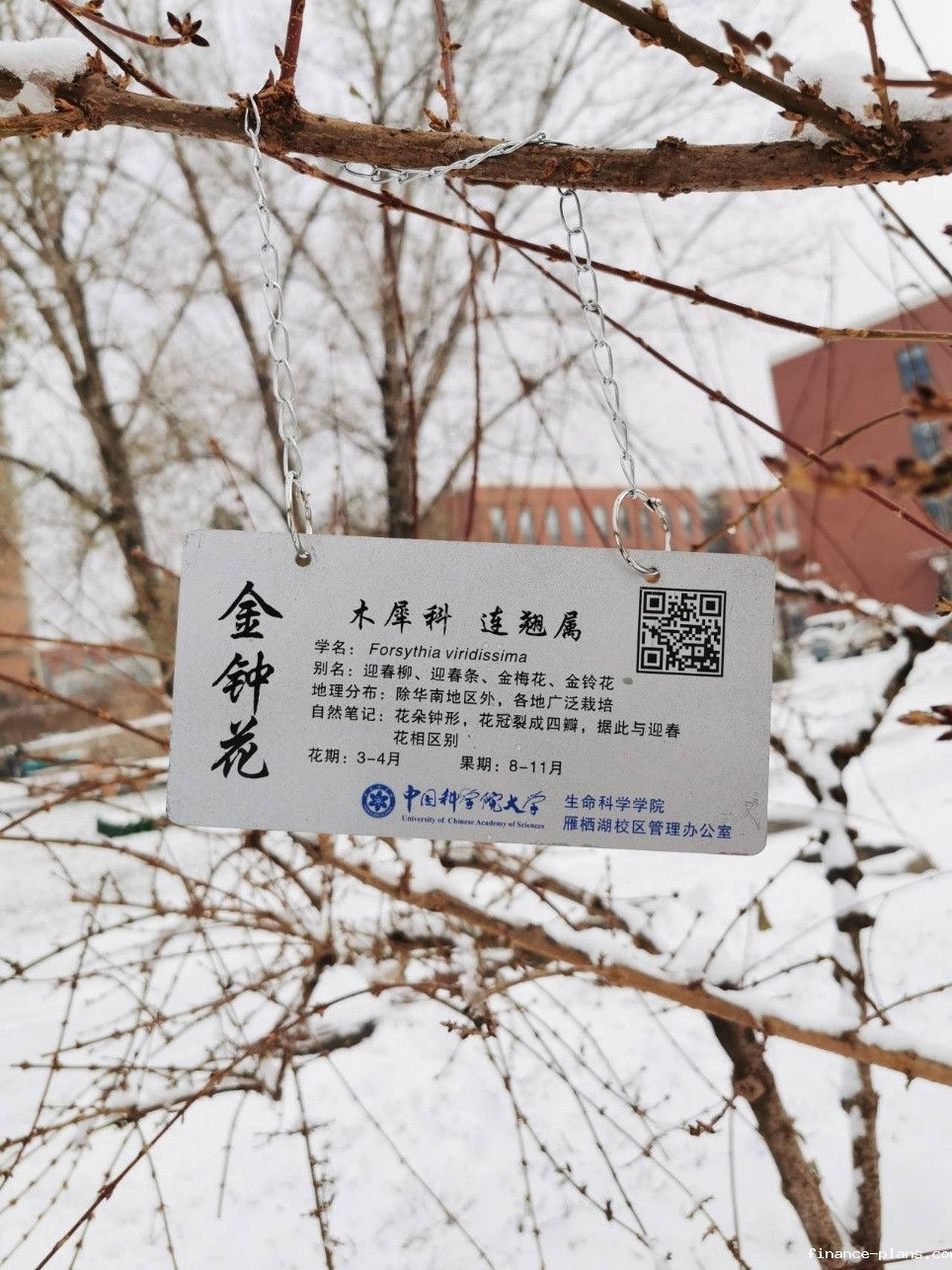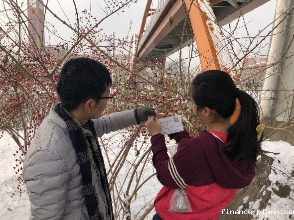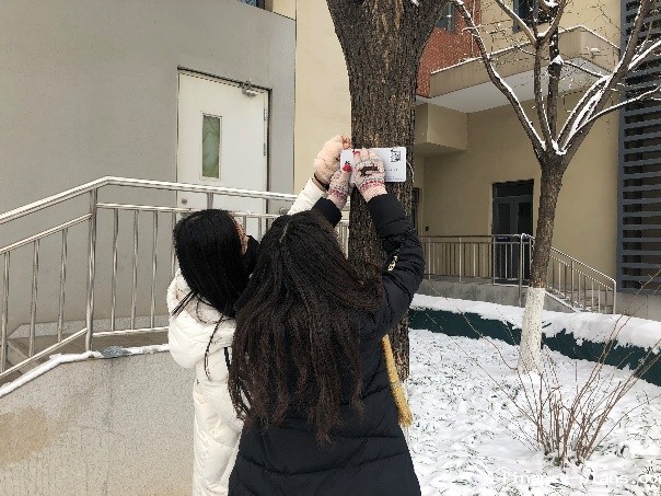 植物认知专项组同学先在教室集合进行了任务分工。姜丽莎同学向大家讲解挂牌过程中的注意事项。16名植物认知专项组同学分为4组,根据上次秋季植物认知活动的路线进行路线分工。刘秋蓉同学在分配挂牌工具。初雪过后,学校银装素裹,充满着冬季的浪漫气息。大家一起踏雪挂牌增添了几分别样感受。小分队出发!