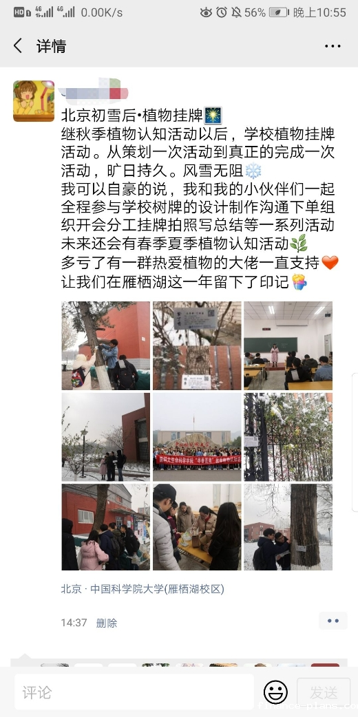 冬季许多植物没了叶子,难以辨认具体种类,增加了挂牌的难度。挂牌途中,每一个细小的发现都能引起大家的激烈讨论,挂牌活动变成移动小讲堂,专项组同学都有着扎实的植物认知基础。大家认真观察植物的特性确保挂牌的准确无误。
