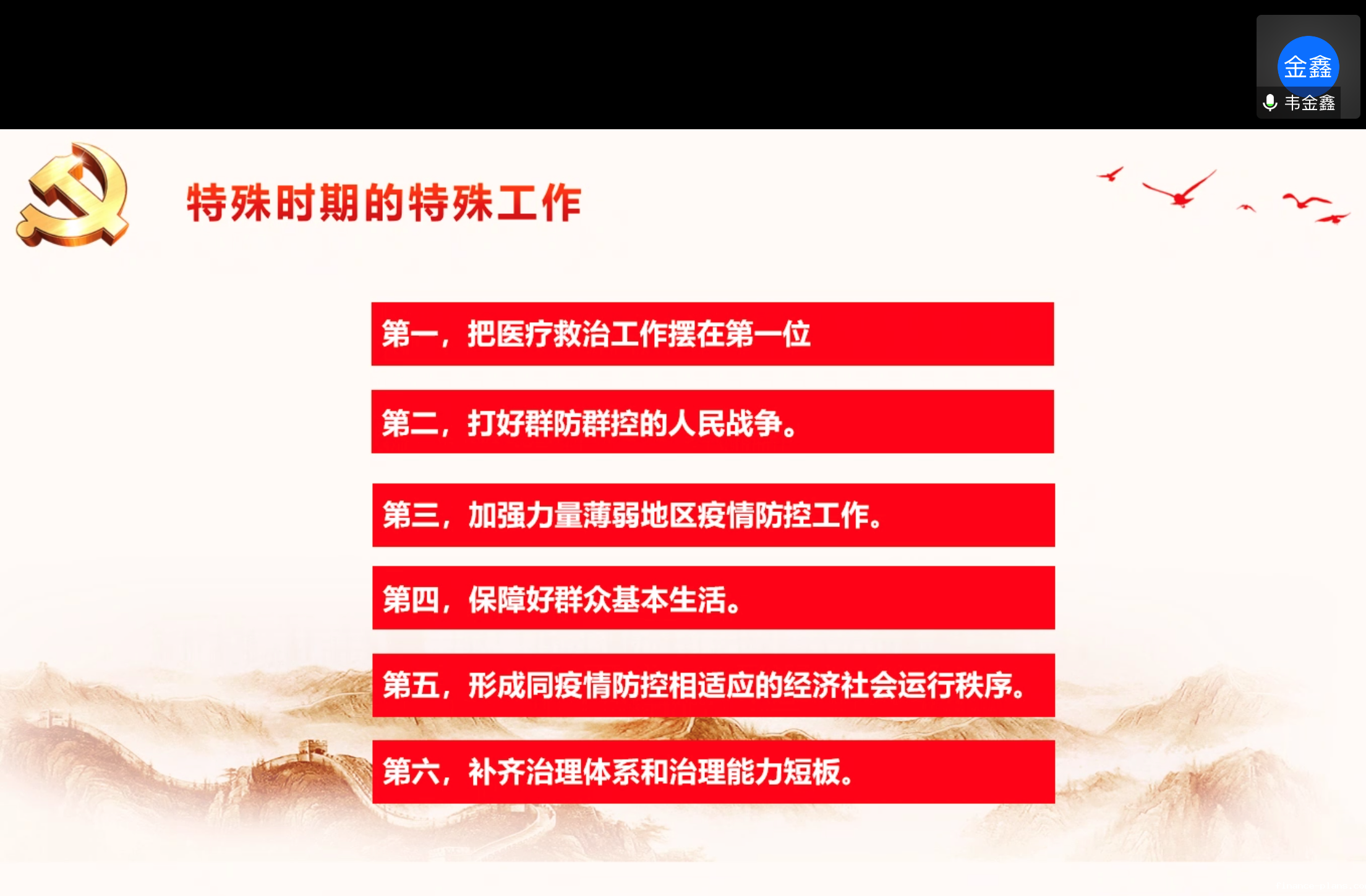 首先,周改芳带领大家回顾了习近平给北京大学援鄂医疗队全体“90后”党员的回信,并观看了北京大学援鄂医疗队党员代表吴超同志的采访视频。本次抗击疫情的斗争中,以“90后”为代表的青年一代挺身而出,担当奉献,充分展现了中国新时代青年的精神风貌。