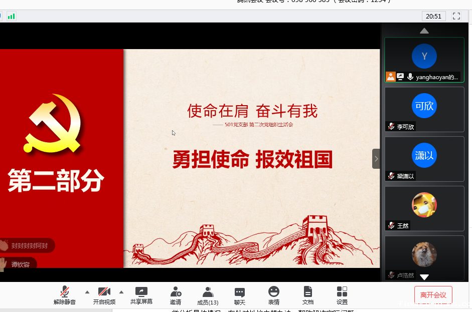 5月23日下午7点,20190501党支部召开了主题为“使命在肩,奋斗有我”线上组织生活会暨民主评议会。会议由支部第二学习小组主持召开,支部13名成员参与会议。
