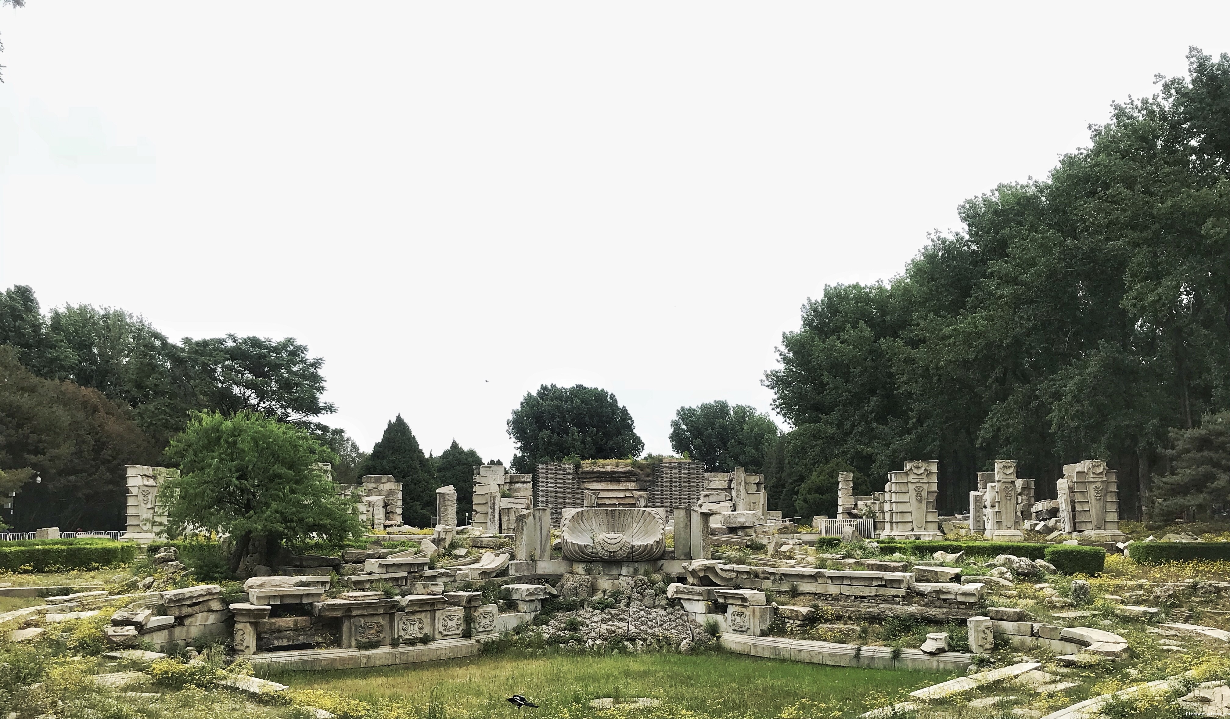 圆明园的毁灭留下了世人无尽的遗憾,在这样一片废墟之下,我仍看到:夏树苍翠,湖心泛舟,风光旖旎。小鸭子在水面悠哉悠哉,缓缓游走。锦鲤一簇簇,生机勃勃。绿色的细柳和湛蓝的天空倒映在水面,这是一幅大自然的画卷。