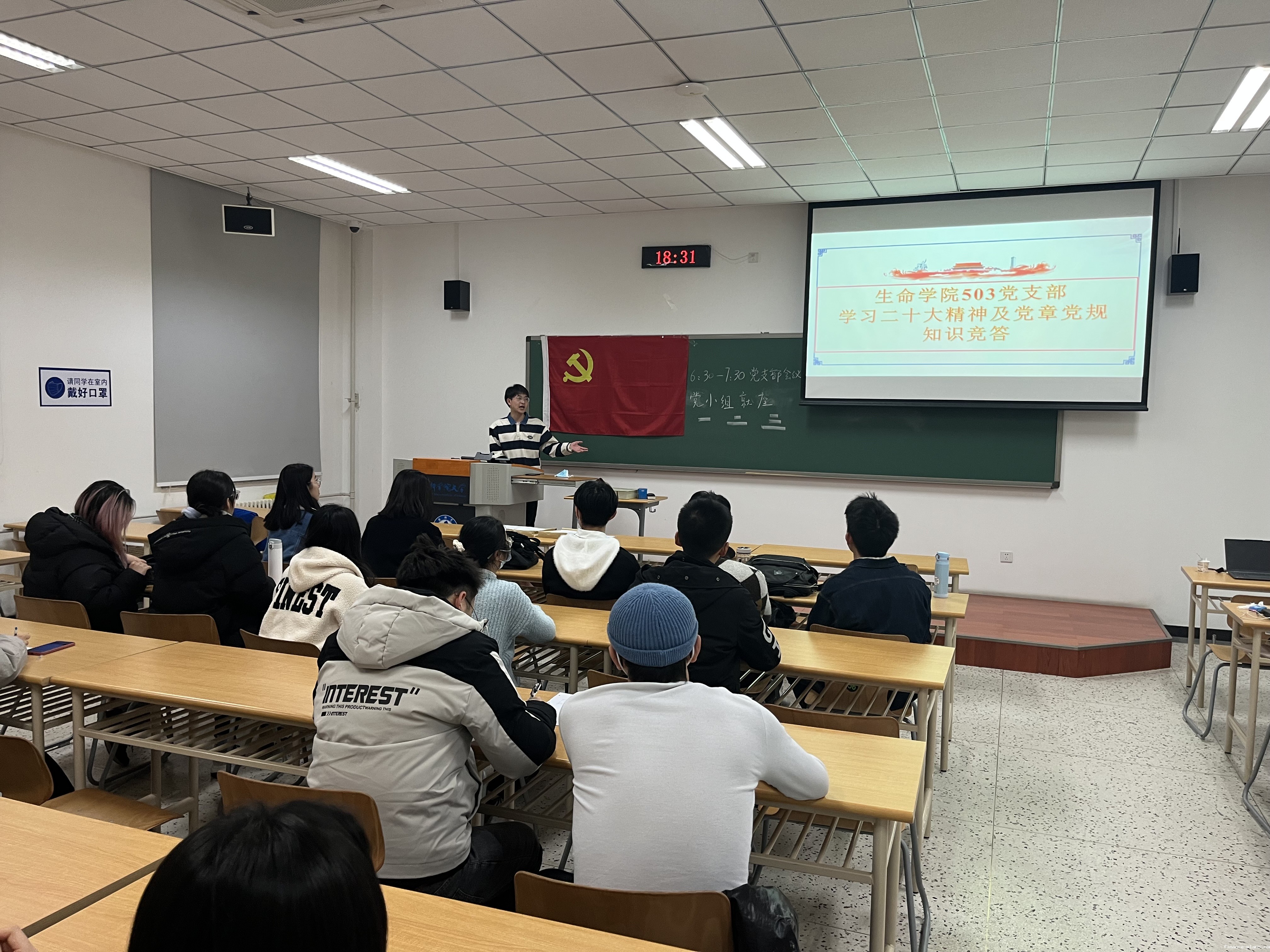 2022年11月26日晚,教二楼319教室内气氛紧张又热烈,生命学院20220503支部举办的二十大精神及党章知识竞答活动正如火如荼举行。支部内三个党小组各为一队进行团体抢答赛,随着24名党员同志一轮接一轮激烈地抢答,比分不断超越又追平,竞答现场气氛不断被推上高潮。