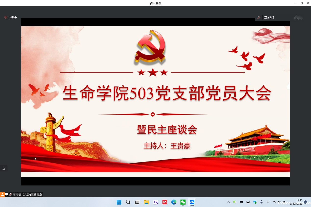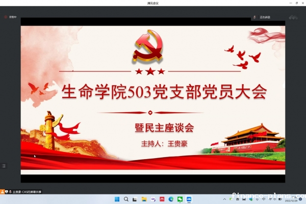 2022年12月28日晚7点,生命学院20220503党支部召开支部党员大会暨民主座谈会。由于疫情原因,此次会议为线上举行。支部全体党员共29人参加。会议主要内容有:支部书记王贵豪作支部年度工作总结,支部党员评议支部年度工作,支部工作民主测评。