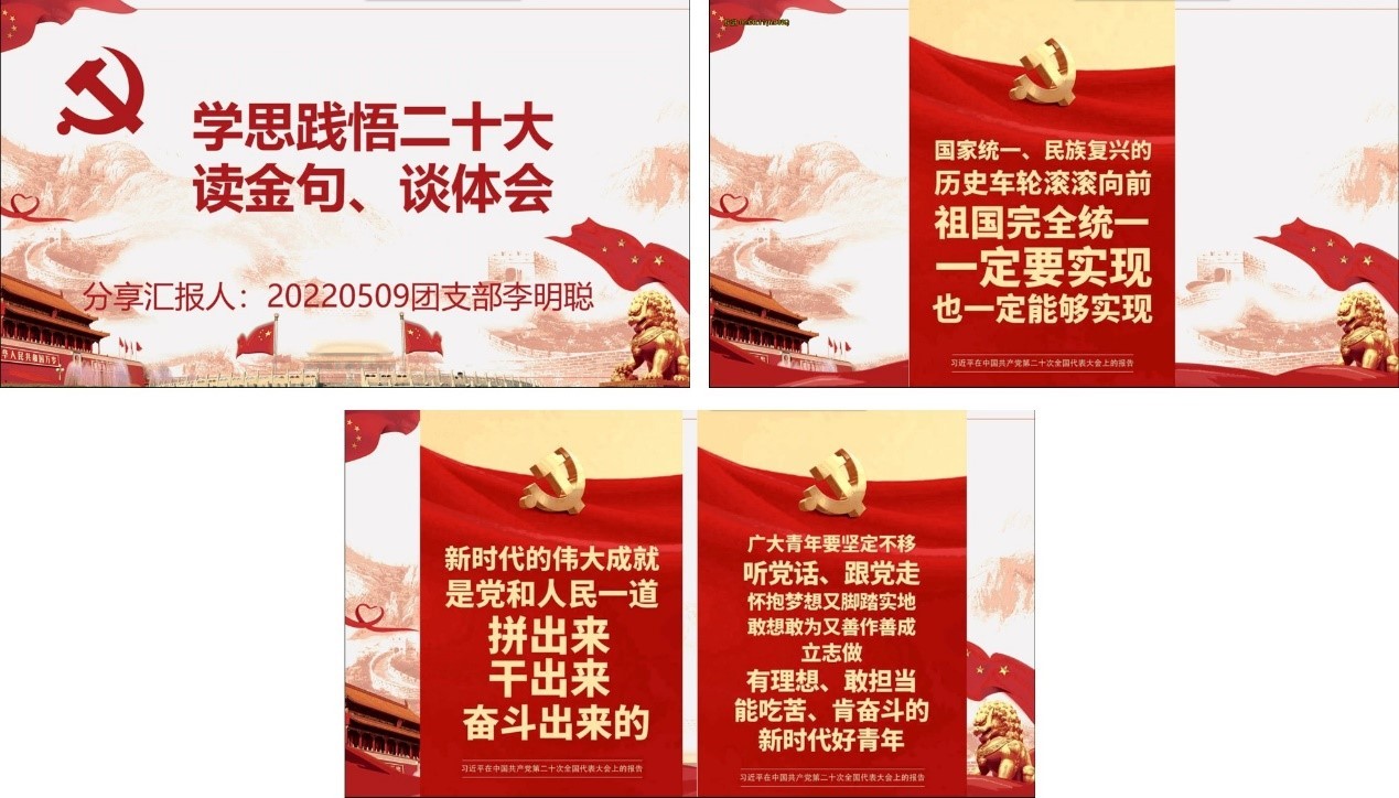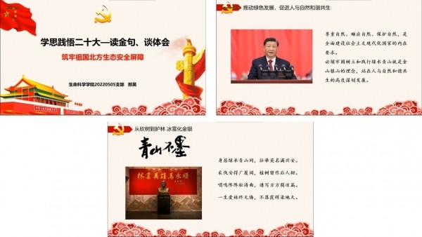 其中501支部多名同学以新闻报道连线各地记者的形式,表达自己对二十大金句解读的感想。505支部的郎昊同学围绕习近平总书记在二十大报告中有关生态安全方面的内容,站在人与自然和谐共生的角度,结合西北万亩防护林被毁事件,以及小兴安岭青山不墨、林海英雄马永顺事件谈了自己对二十大金句的理解,并深刻认识到生态就是资源,生态就是生产力。509支部的李明聪同学通过诵读相关金句,表示感悟到了祖国的统一和中华民族的伟大复兴,在中国共产党的领导下势必会实现。在党的领导下,我们应该更好地把握使命要求。他表示也会尽可能将自己的小课题与实现中华民族伟大复兴的大课题相结合,立志做一名有理想、敢担当、能吃苦、肯奋斗的新时代中国青年。