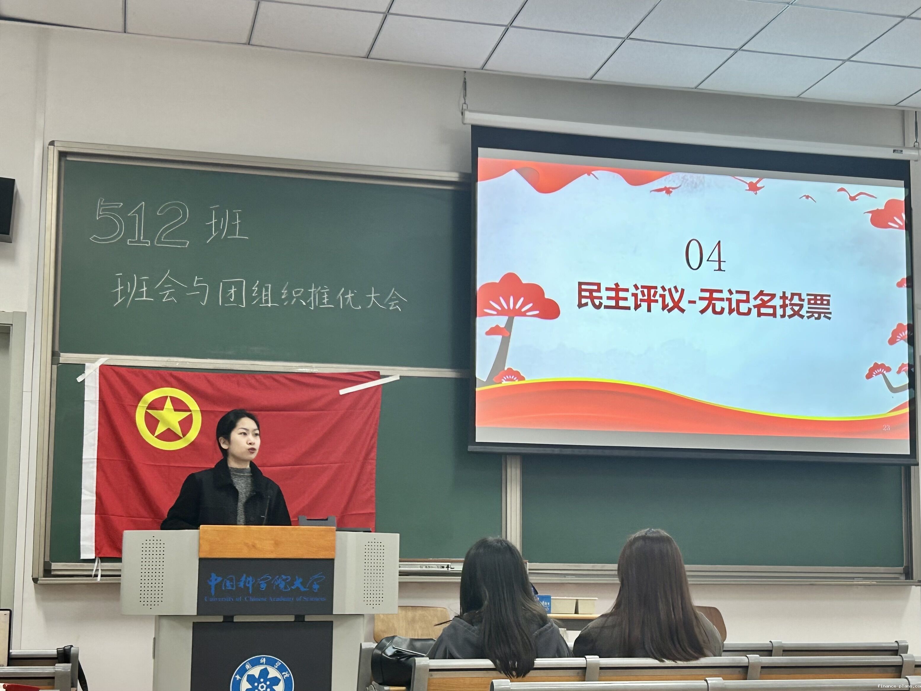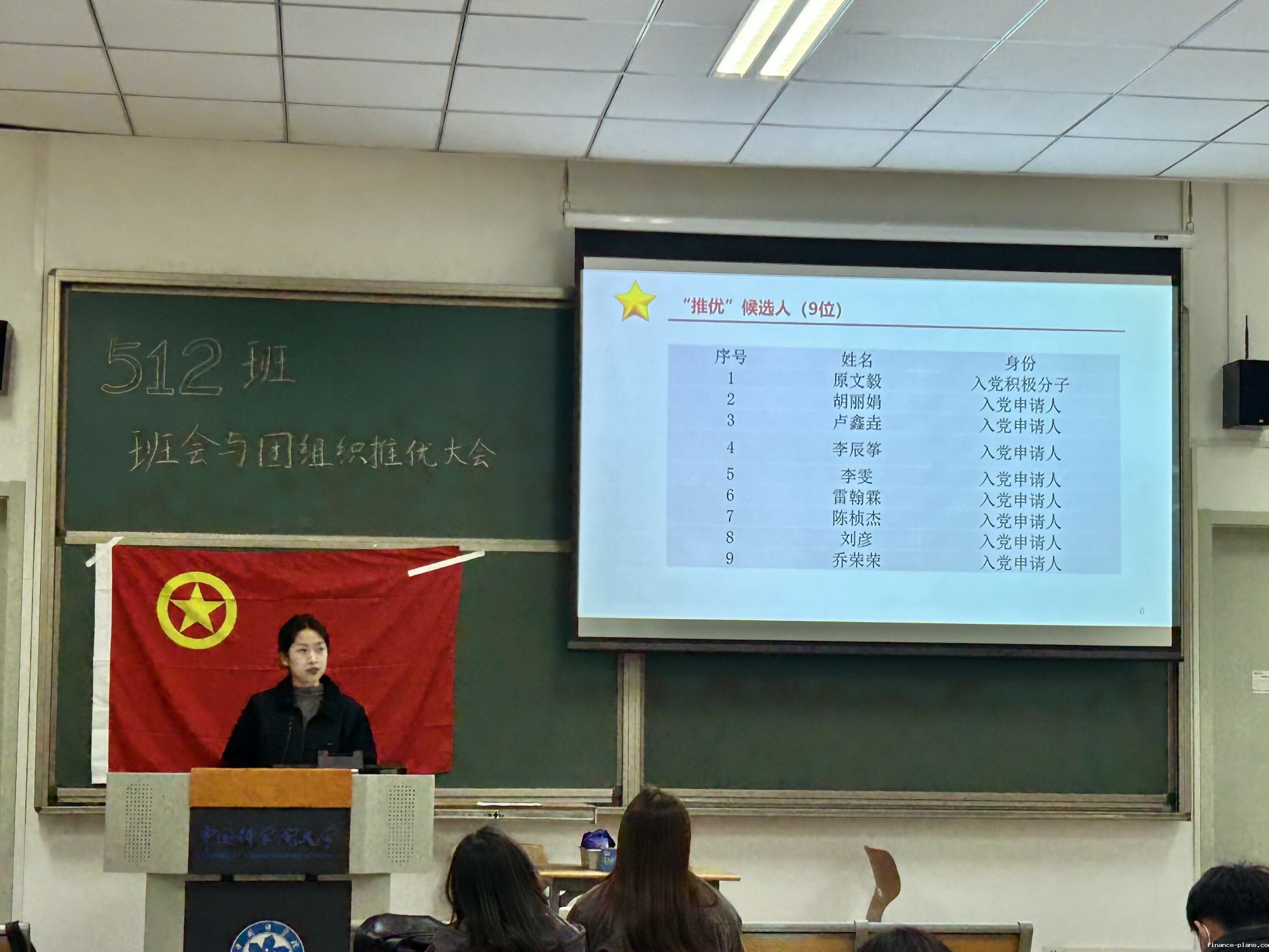为加强团组织自身建设,进一步做好发展党员工作,充实党的新生力量,华体育会app官方下载官网512团支部于2023年3月18日晚19:30于教二-127召开512团支部“推优”大会。此次会议由团支书常露丹主持,按照“推优”大会流程对团支部8位入党申请人、1位入党积极分子进行民主评议,以明确其是否能进入入党积极分子、党员发展对象的考察环节。此次会议共有43名团员到会。