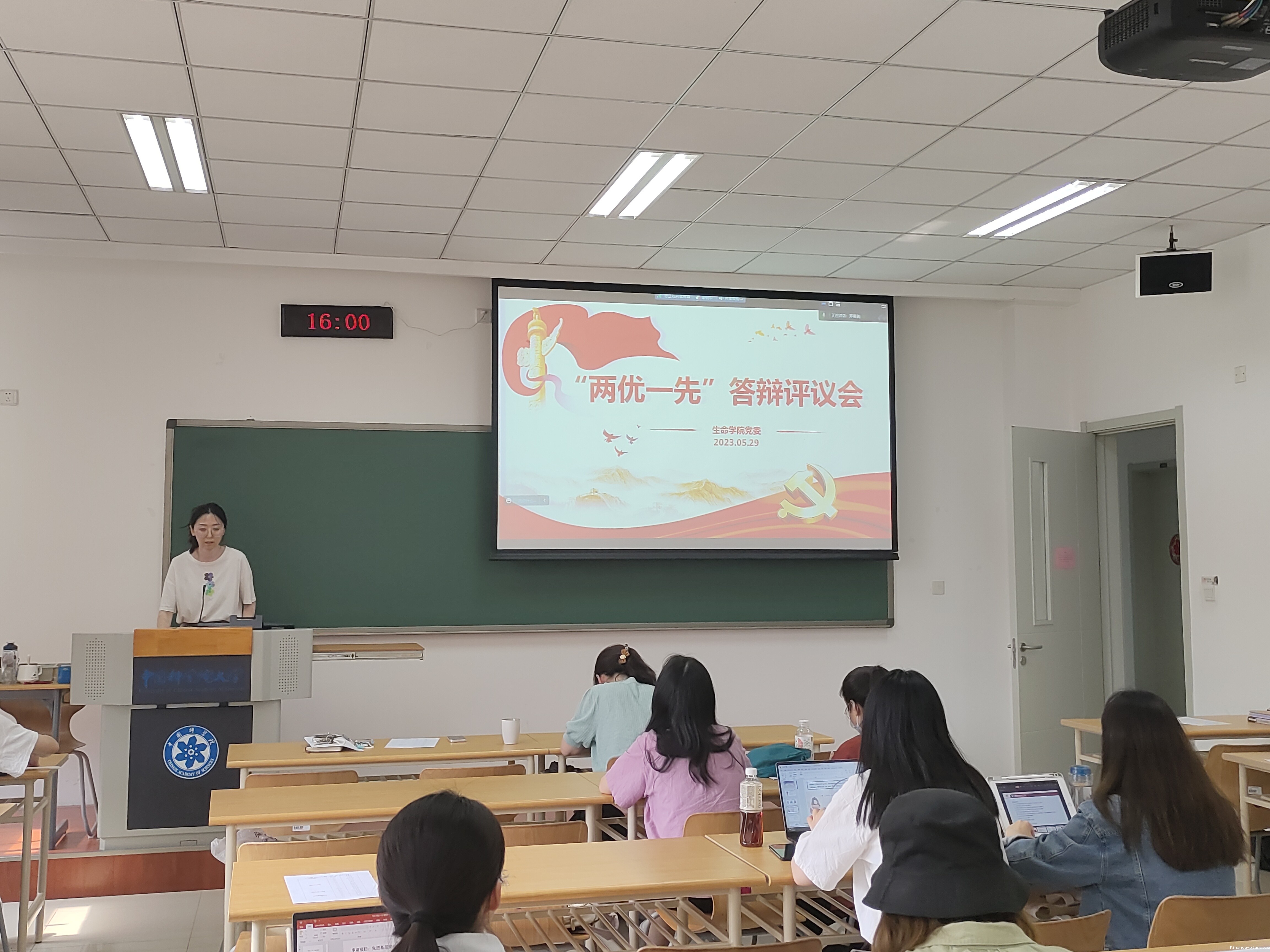 为深入学习贯彻习近平新时代中国特色社会主义思想和党的二十大精神,充分发挥先进典型示范引领作用,2023年5月29日下午,生命学院党委在学园三450召开了2022-2023学年“两优一先”答辩评议会,生命学院党委副书记王洁婷、党委委员崔骁勇、党委组织员郑馨慧、15个学生支部评委以及候选人参加。