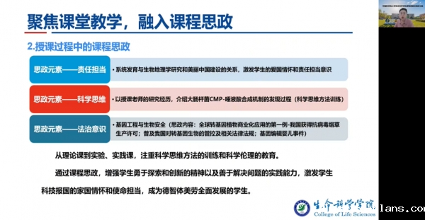 本次会议首先由生命学院党委副书记王洁婷介绍了学院课程思政建设工作。王洁婷介绍了学院课程思政的建设目标和教育体系,从教师培训、课前备课、课堂教学、课程督导四个方面介绍开展课程思政建设的各项举措。学院102门课程均融入了家国情怀、科学家精神、科学诚信、法治意识、知识产权以及道德修养等课程思政元素,督导专家对课程思政内容进行专题评价。优秀的课程思政建设成果来源于一线授课教师的辛勤耕耘,分享了促进思政育人与专业教育的协同融合的好办法。课程思政是学校“大思政”育人格局的重要组成部分。授课教师肩负着“立德树人、全面育人”的职责,在课程思政实践中做好“四个引路人”,成为“四有”好老师,做到“人人能思政、处处讲思政”,引领优秀的教风和学风。