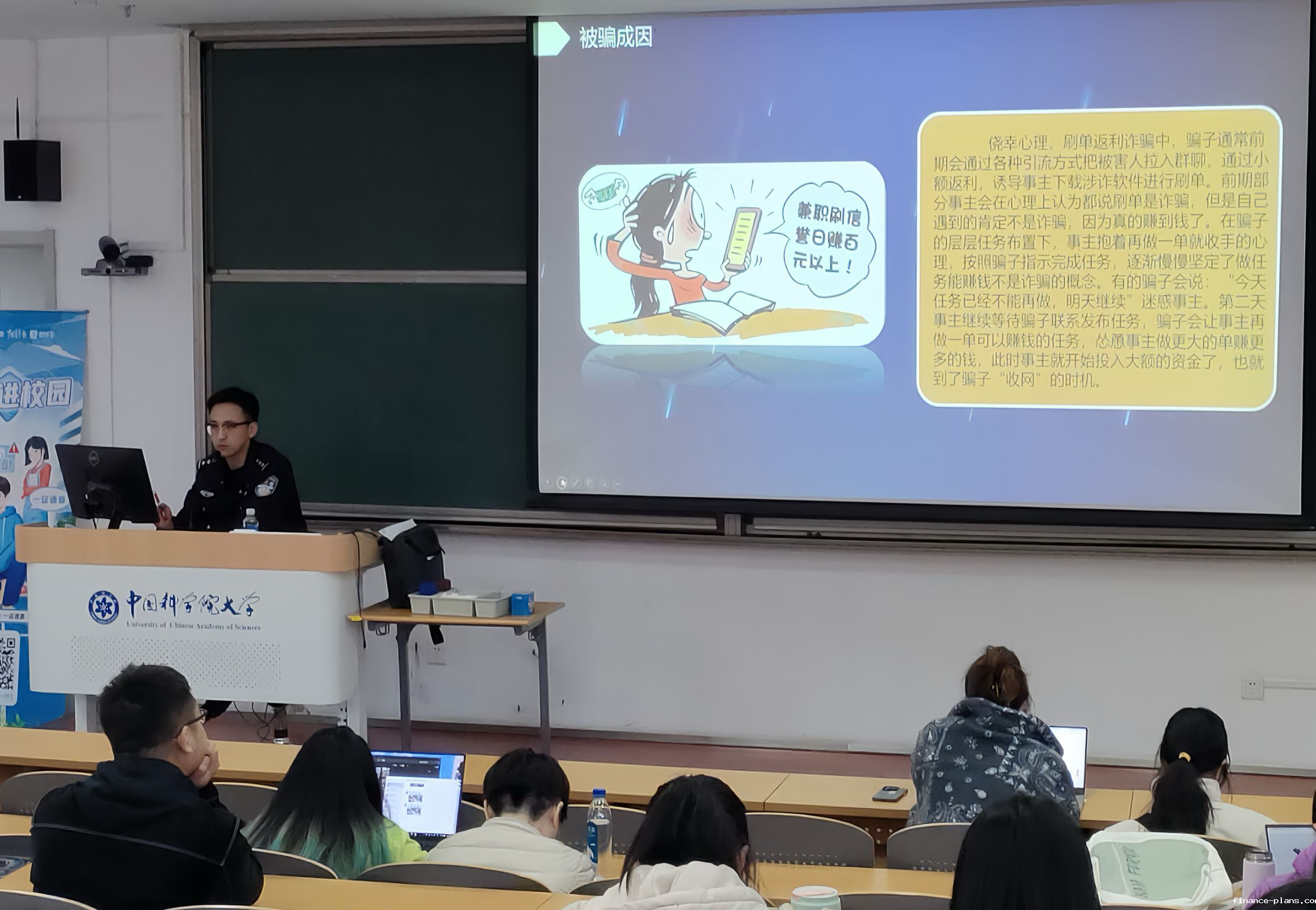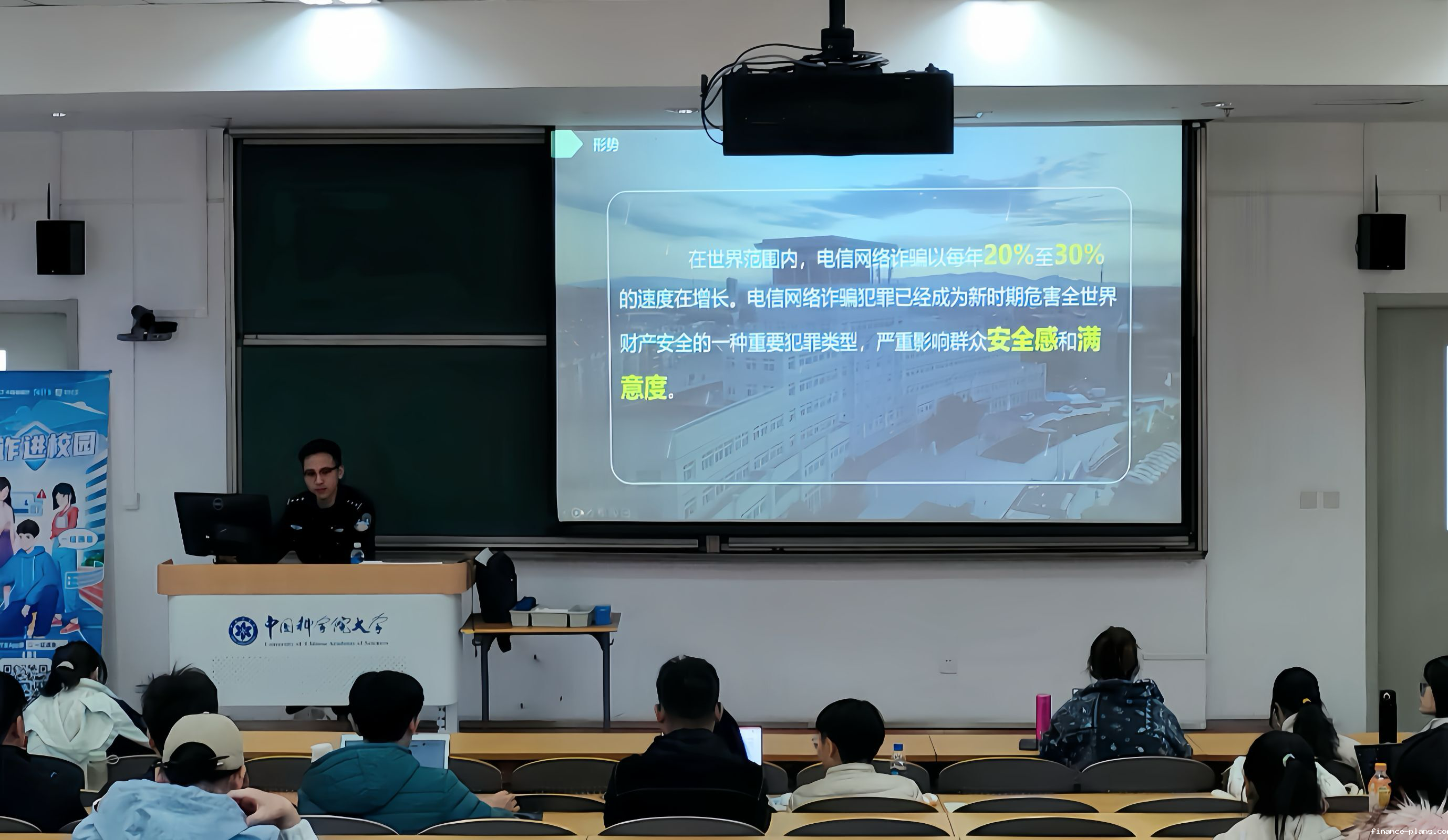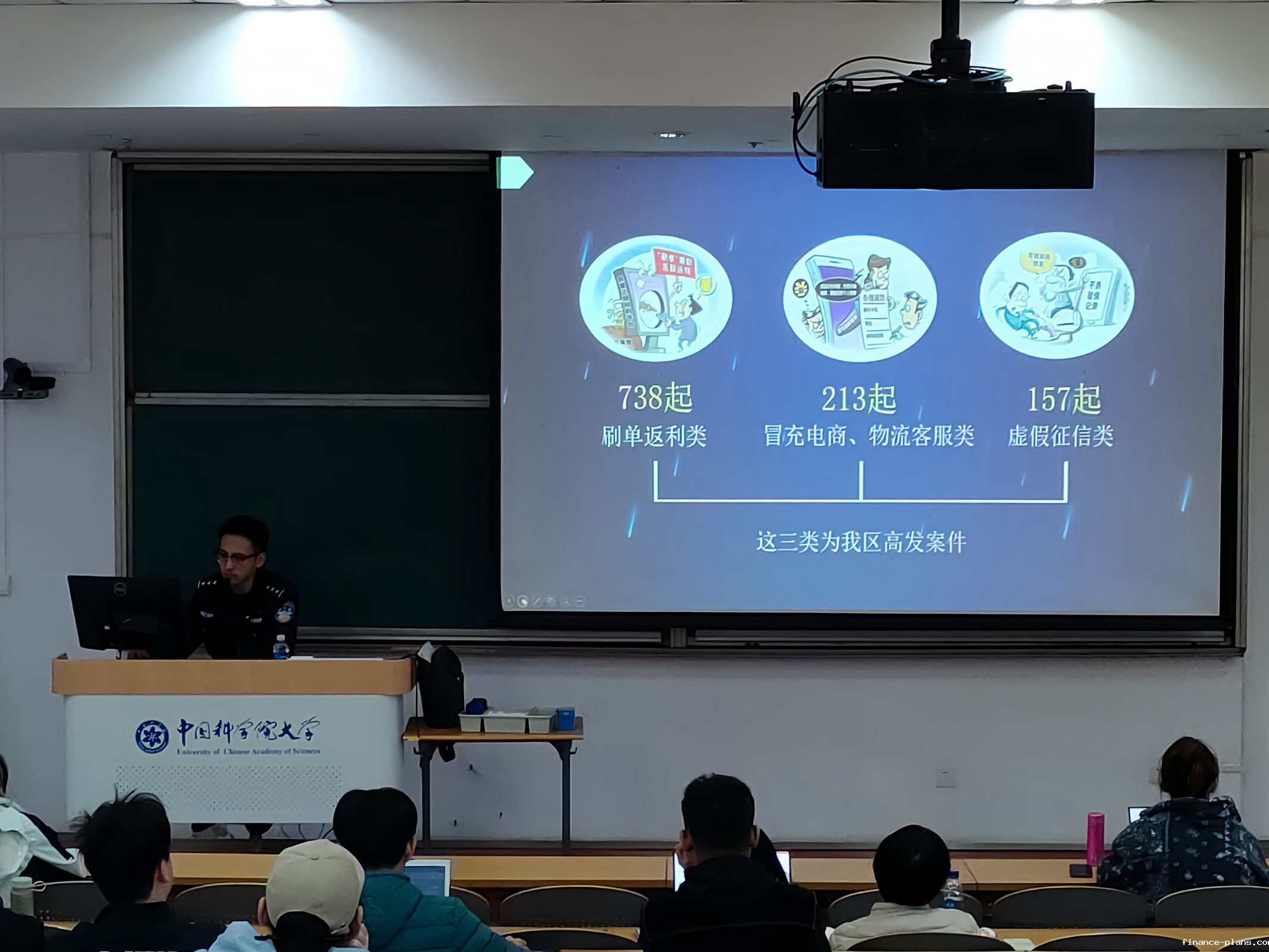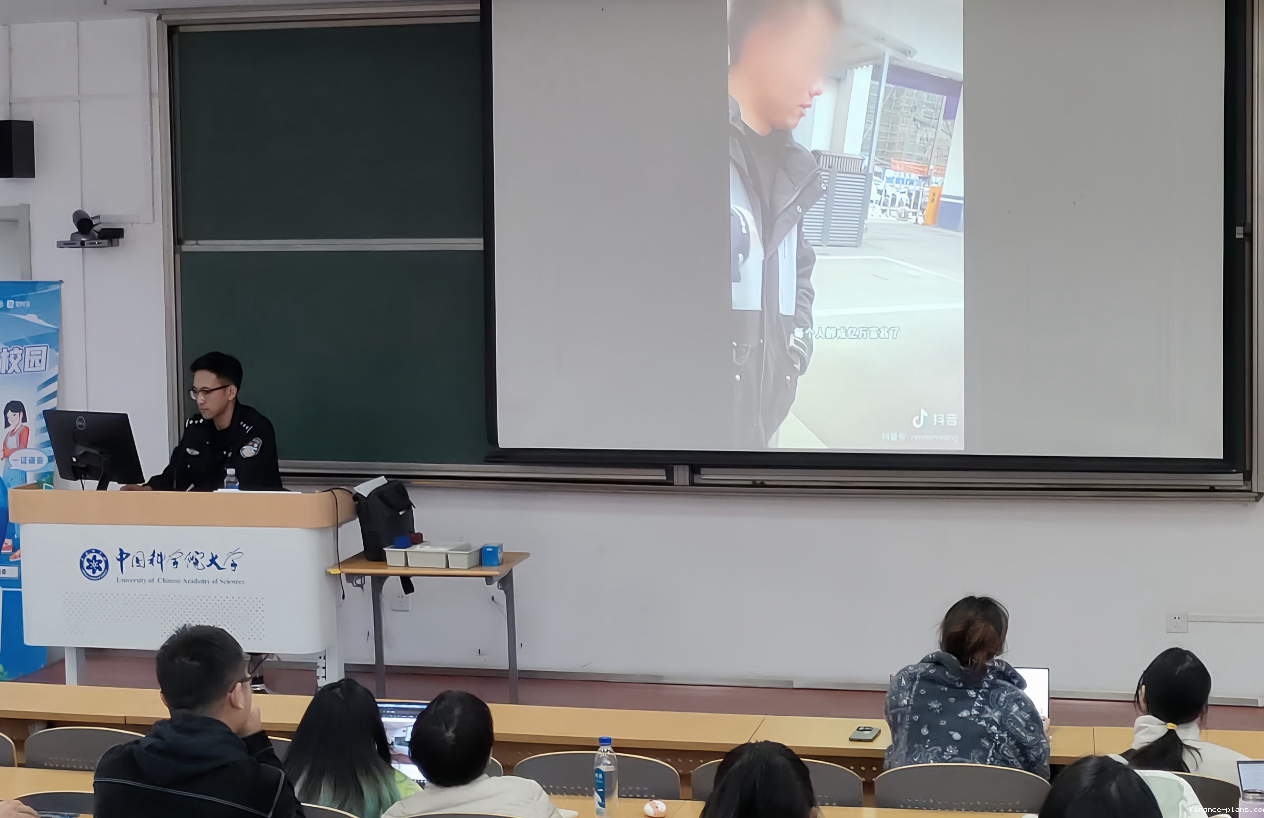 首先罗警官向大家介绍了在国科大学生群体中发生的网络诈骗真实案例,例如在社交网络上购买门票、购物、交友聊天等;接着,他介绍了电信网络诈骗的概念,表示在世界范围内,电信网络诈骗以每年20%-30%的速度在增长,电信网络诈骗犯罪已经成为新时期危害全世界财产安全的一种重要犯罪类型,严重影响群众的安全感和满意度。