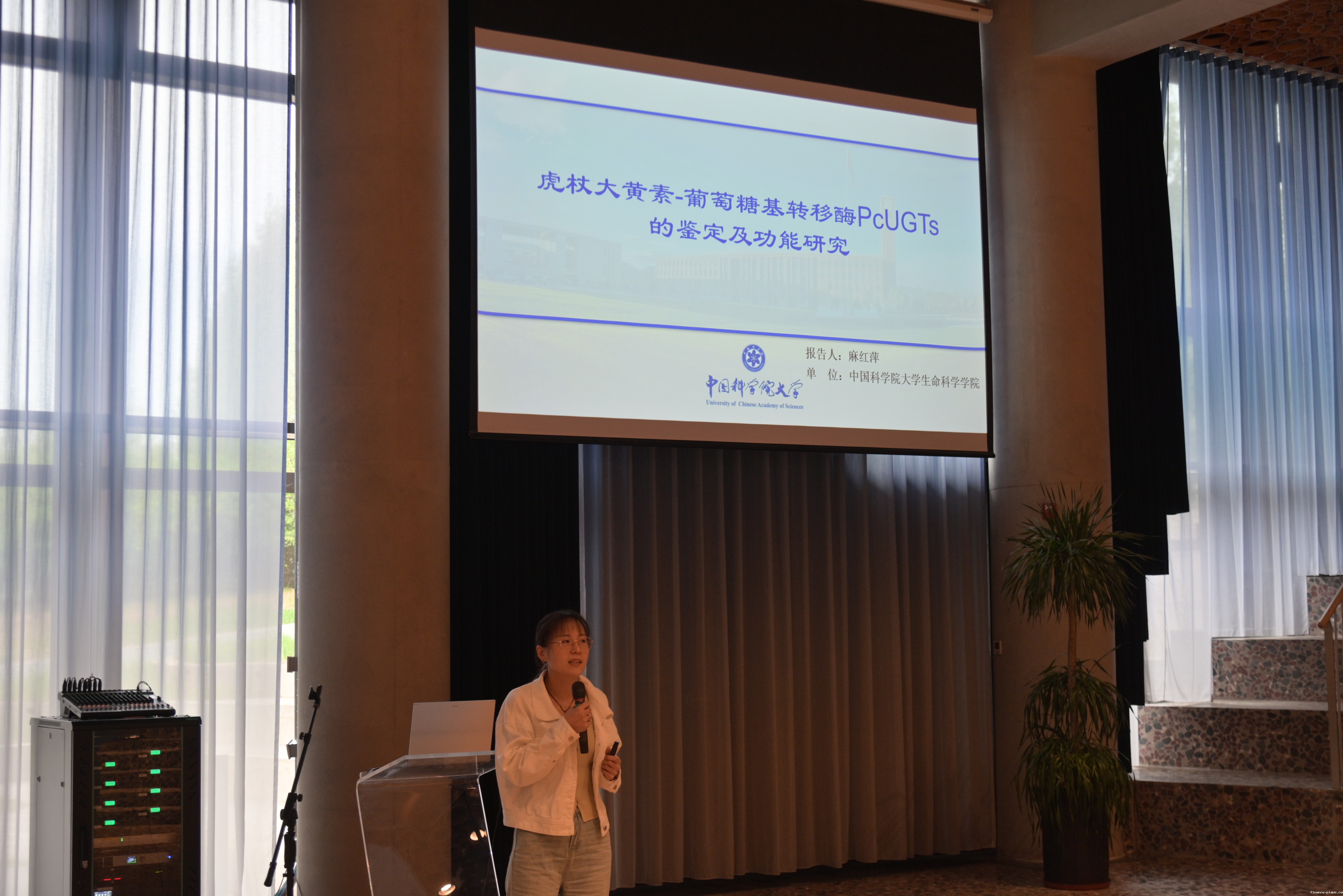来自植物分子生物学课题组的麻红萍同学的报告主题为:虎杖大黄素-葡萄糖基转移酶PcUGTs的鉴定及功能研究。她利用代谢组学和转录组学技术成功筛选到多个PcUGT基因,并成功构建高效的虎杖发根体系,最终确定PcUGT3BF6具有更高的亲和力和催化活性。随后使用分子对接等手段,确定PcUGT3BF6的底物结合位点,进行点突变,成功提高其催化活性。