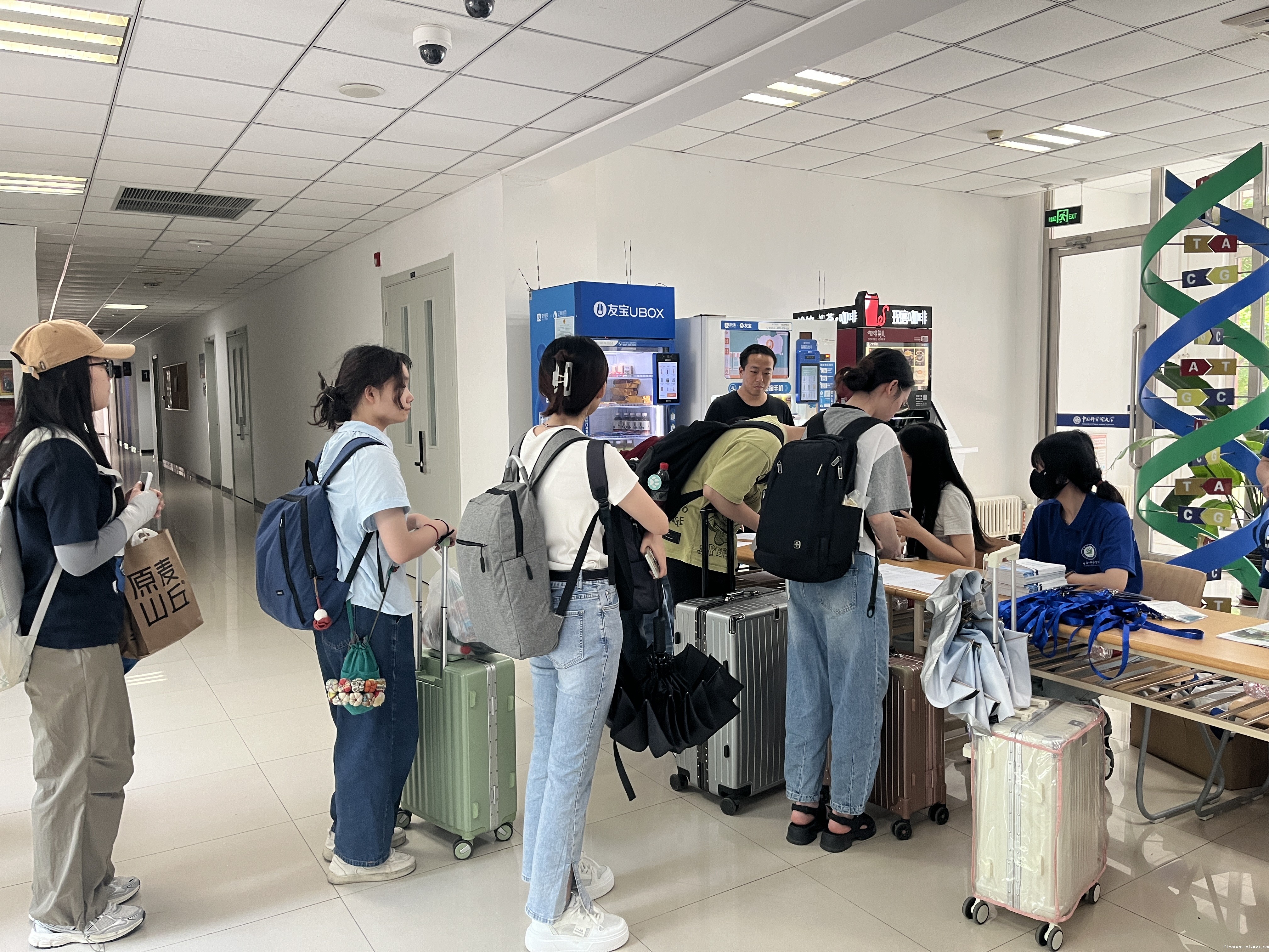 7月10日上午,营员们坐上接站的班车,陆续抵达雁栖湖校区报到。在志愿者的引导下,营员们有序完成了报到流程,领取到生活物资,成功入住宿舍。