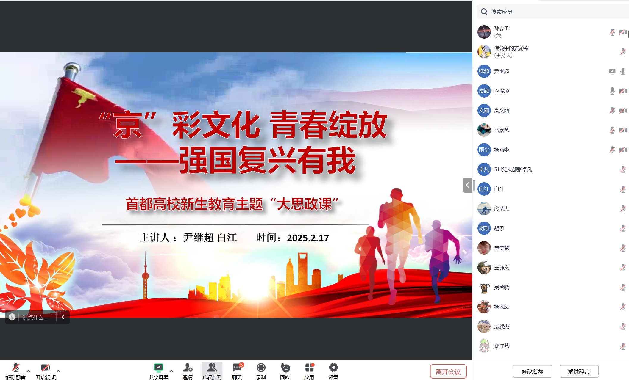 为深入学习贯彻习近平新时代中国特色社会主义思想,引导青年学子厚植家国情怀,激发党员同志们作为新时代青年的责任感和使命感。2025年2月17日,生命学院511党支部于线上举办主题党日活动,组织支部全体成员观看“‘京’彩文化、青春绽放”行动计划——“强国复兴有我”首都高校新生教育主题“大思政课”。本次活动由支部党员白江与积极分子尹继超主持,党支部全体党员及积极分子共17人参会。